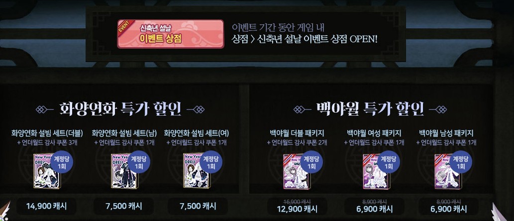 화양연화 설빔 세트 (더블) + 언더월드 감사 쿠폰 3개를 14,900 캐시에,