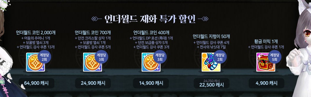 다양하게 구성되어 있는 언더월드 재화 특가 할인도 놓치지 말고