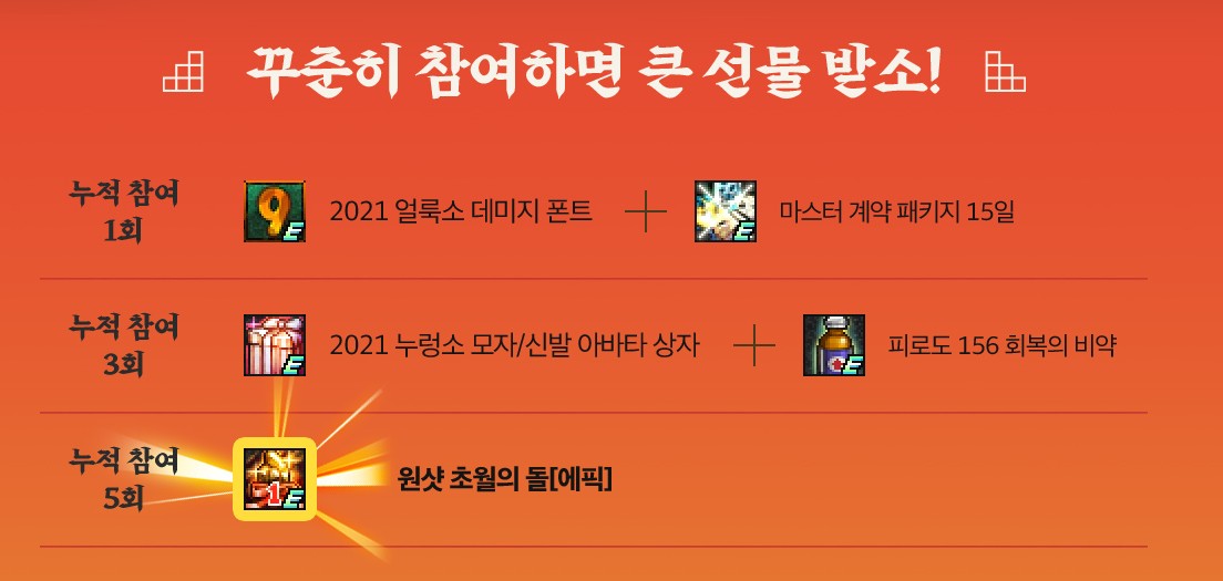 누적 3회 참여 시 2021 누렁소 모자/신발 아바타 상자와 피로도 156 회복의 비약,