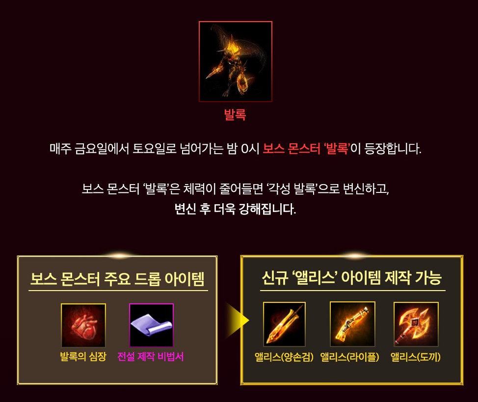 또한 매주 금요일에서 토요일로 넘어가는 밤 0시 보스몬스터 '발록' 이 등장합니다.