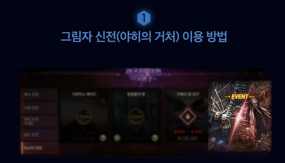 그림자 신전 (야히의 거처)는 마스터 던전 UI 내 '마족들의 땅' 을 통해입장할 수 있으며