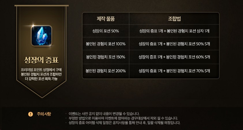 성장의 증표 증표 1개 + 봉인된 경험치 포션 상자 1개 = 성장의 포션 50%