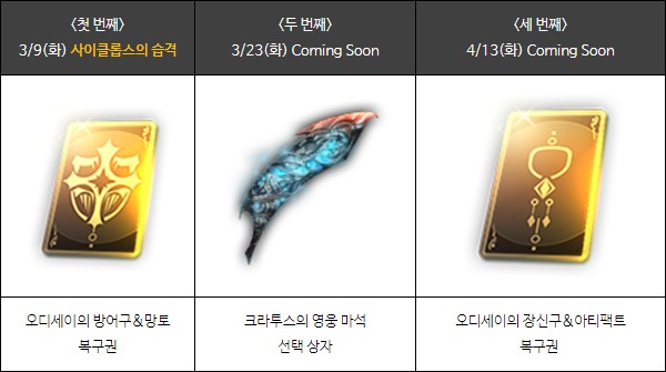 그 첫번째 주자로 3월 9일, 오디세이의 방어구 & 망토 복구권이