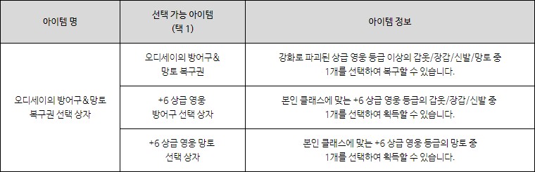 오디세이의 방어구 & 망토 복구권 선택상자의 구성품은