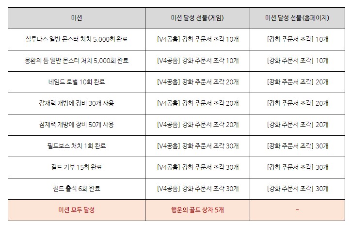 게임내 미션 달성 선물로 획득하는 [V4공홈] 강화 주문서 조각은