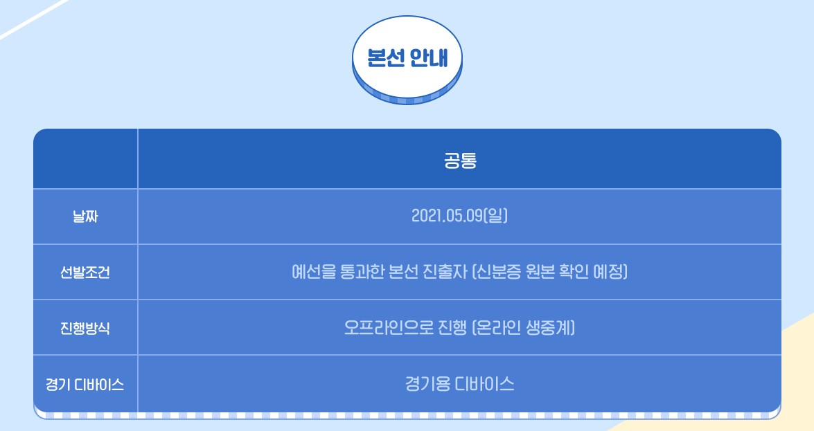 본선은 5월 9일, 예선을 통과한 본선 진출자들이 경기에 참여하게 되며,