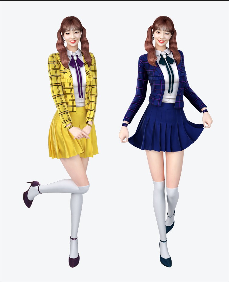 의상은 체크 자켓에 테니스 스커트, 니삭스에 구두를