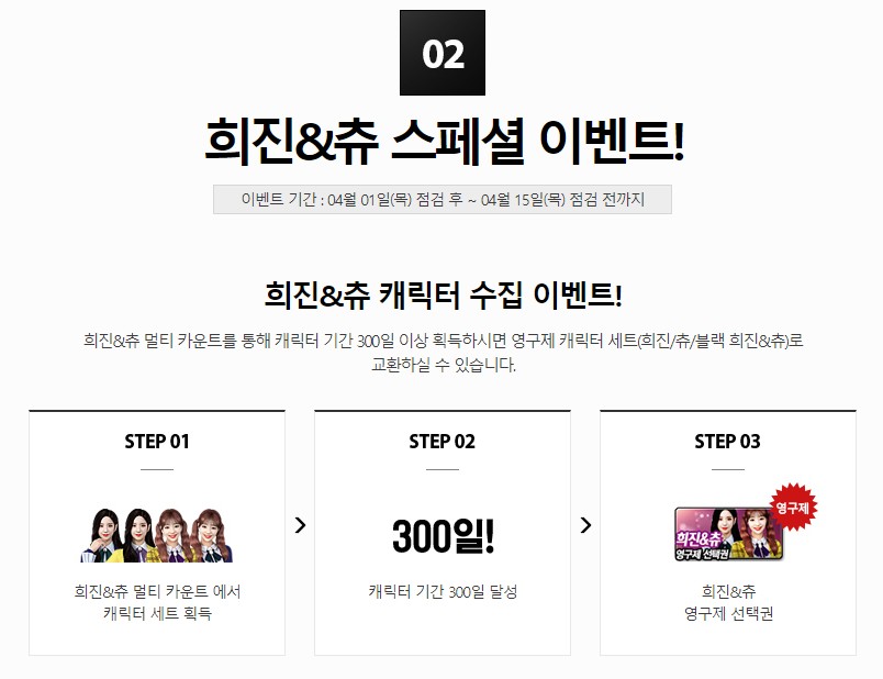 캐릭터 기간을 300일 이상 획득하시면, 영구제 캐릭터 세트 (희진/츄/블랙희진&츄)로