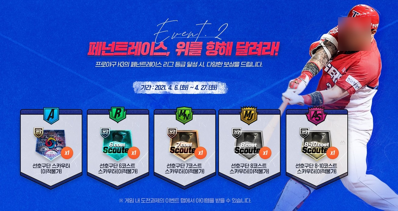 프로야구h3의 페넌트레이스 리그 등급 달성 시, 다양한 보상을 지급하는 이벤트 인데요.