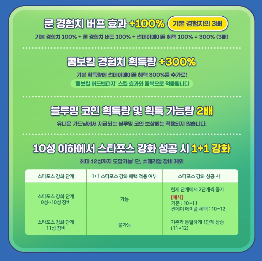 기본 경험치 100& + 룬 경험치 버프 100% + 썬데이 메이플 혜택 100% 까지