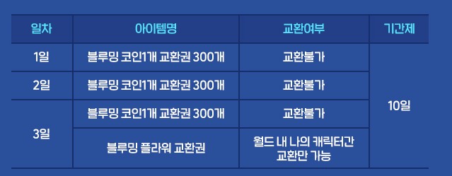 3일차에는 블루밍 코인 1개 교환권 300개와 블루밍 플라워 교환권을