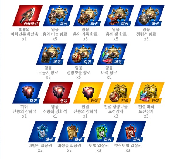 흑룡의 마력깃든 화살촉 1개, 영웅 용의 비늘 향로 5개,