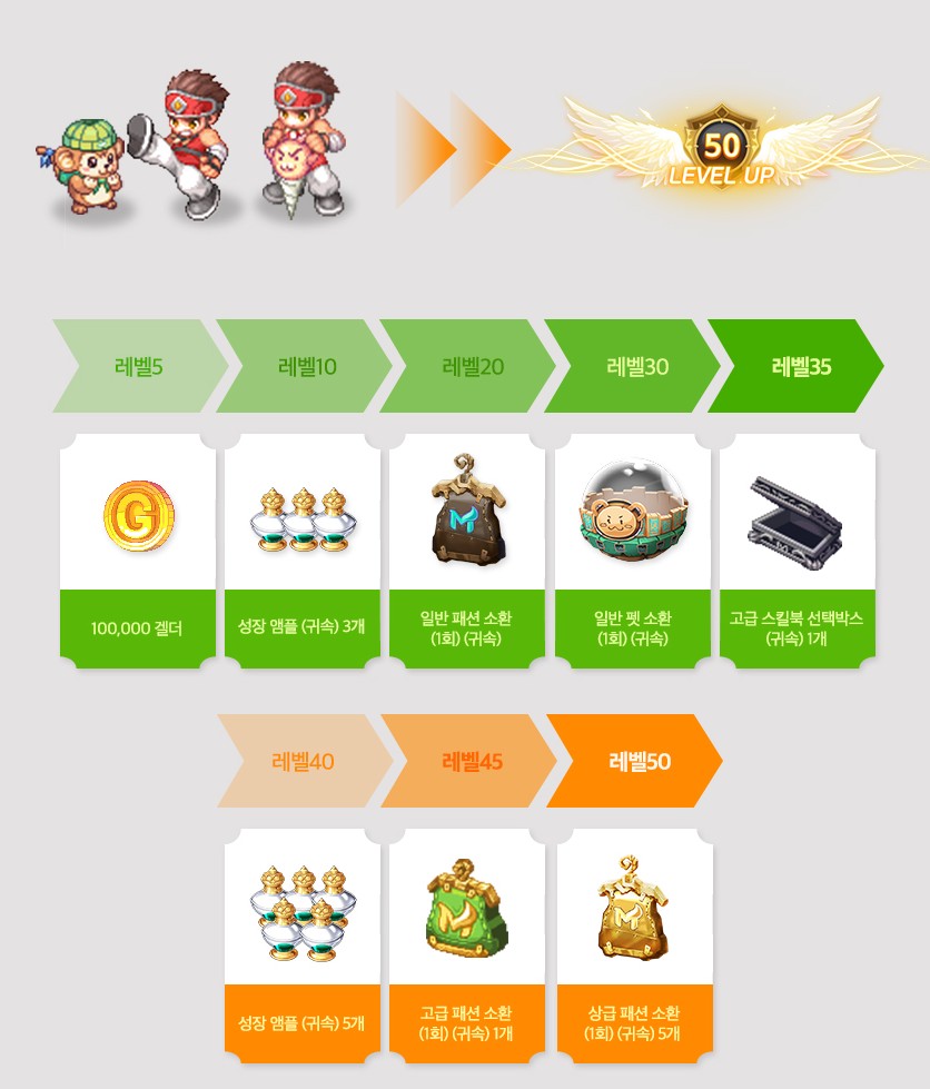 레벨 40 달성 시 성장 앰플 (귀속) 5개를,