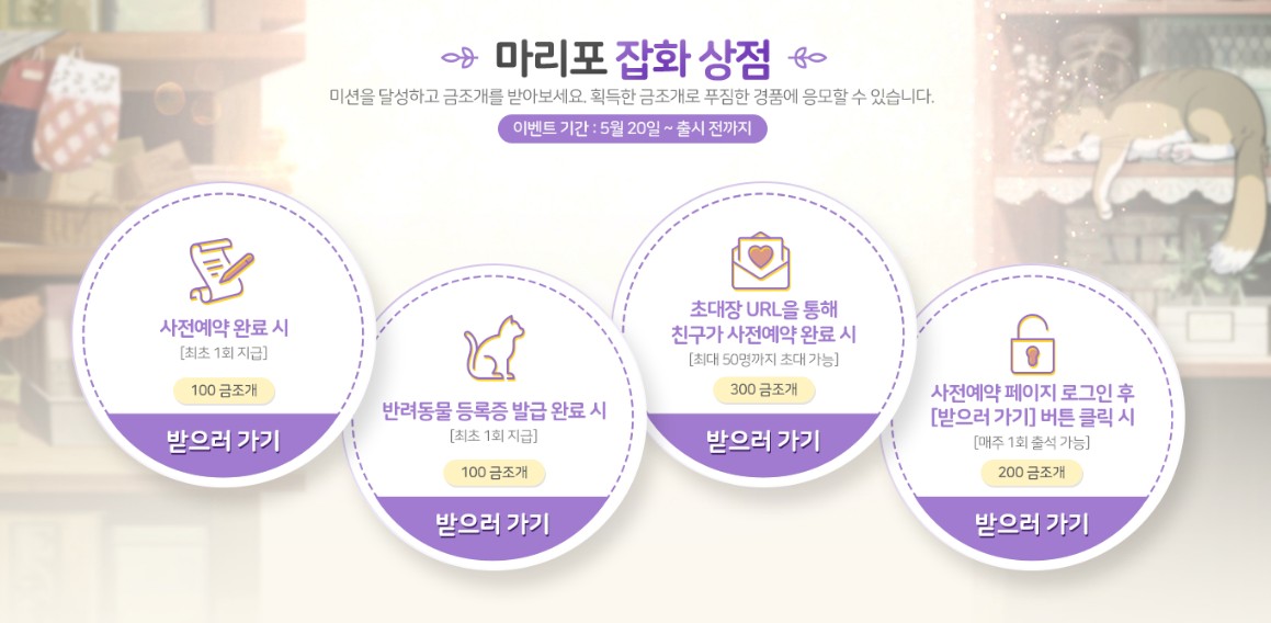 사전 예약 완료시 100 금조개를, 반려동물 등록증 발급 완료시 100 금조개를,