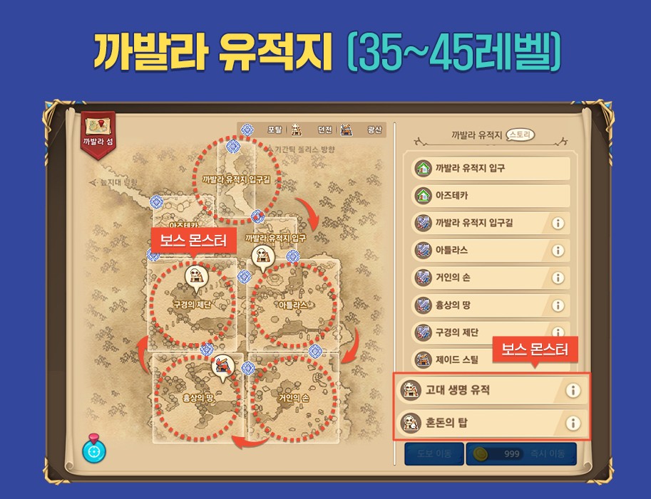 까발라 유적지, 웁스 부두 까지 총 5가지의 레벨 별 적정 사냥터가 있는데요.