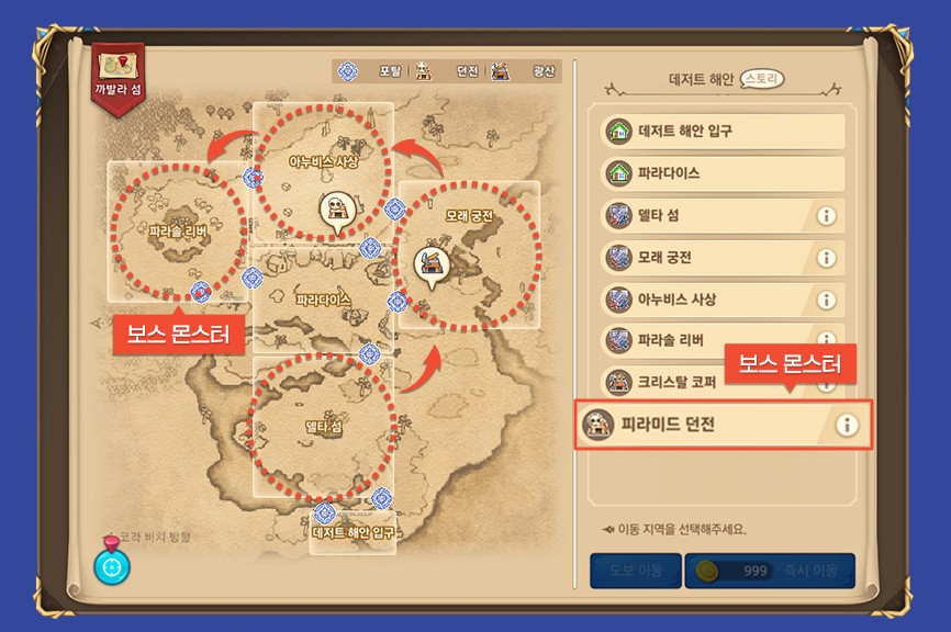 피라미드 던전과 파라솔 리버에는 보스몬스터가 등장합니다.