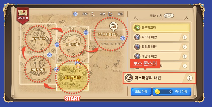 단, 마스터 몽의 해안에는 보스몬스터가 있으니