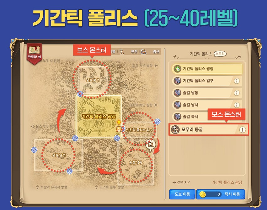 숲길 북서와 포푸리 동굴에서는 보스 몬스터를 만나게 됩니다.