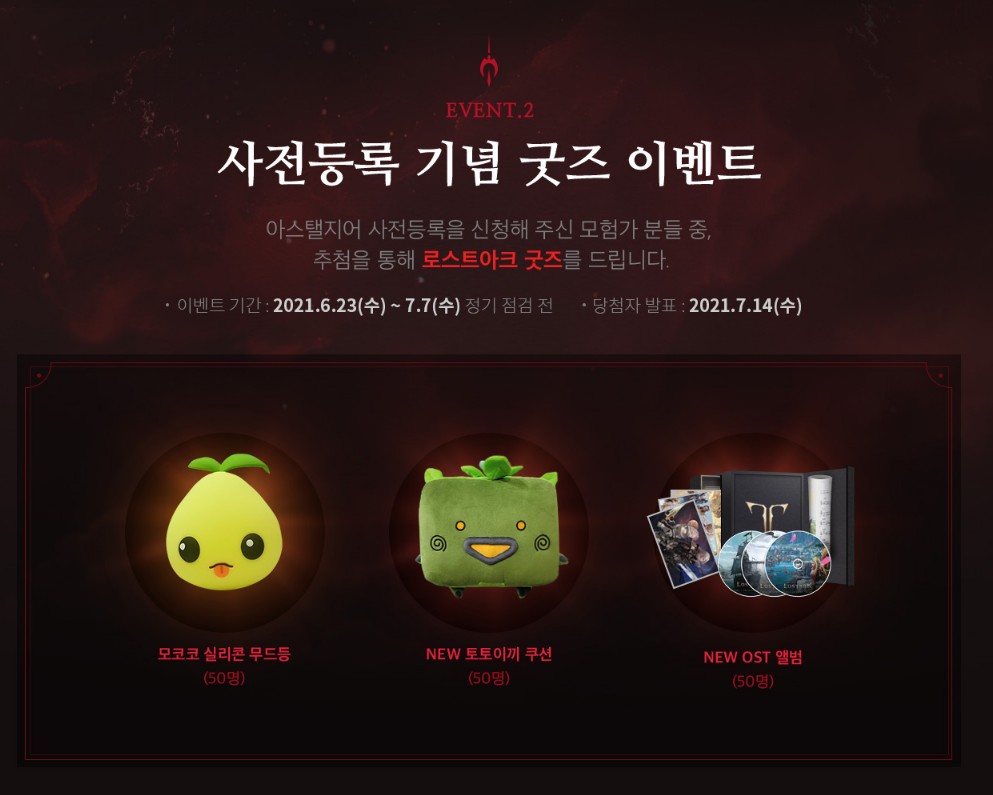 모코코 실리콘 무드등 50명, NEW 토토이끼 쿠션 50명, 로스트아크 NEW OST 앨범 50명