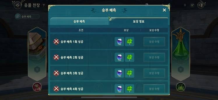 유물 전장 종료 후 승부 예측을 맞춘 개수에 따라 보상이