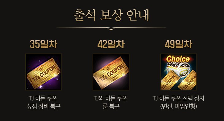 49일차에 TJ 히든 쿠폰 선택상자 (변신, 마법인형) 를 받을 수 있습니다.