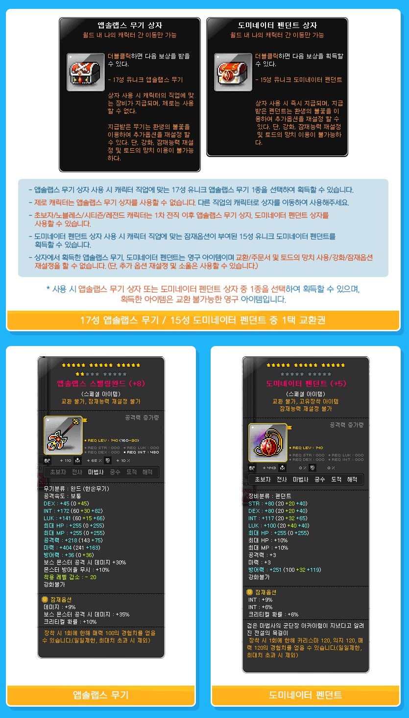 220레벨 달성시 17성 앱솔랩스 무기 / 15성 도미네이터 팬던트 중 1택 교환권,