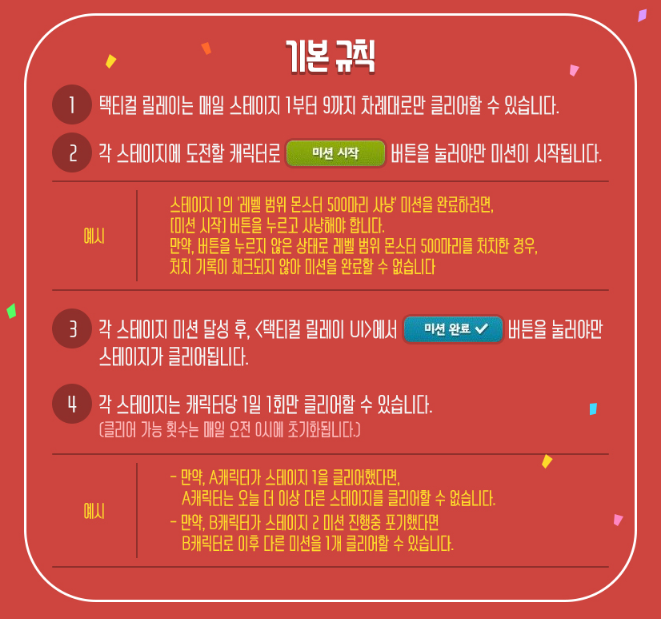 1. 택티컬 릴레이는 매일 스테이지 1부터 9까지 차례대로만 클리어할 수 있습니다.