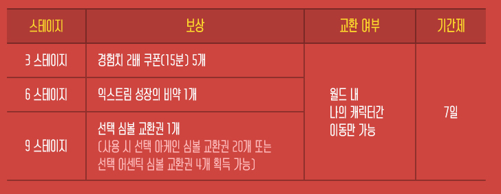 를 받을 수 있습니다. 해당 보상의 기간은 7일이며 월드 내 나의 캐릭터간 이동만 가능합니다.