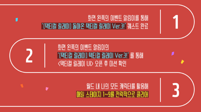 이벤트 알림이 텍티컬 릴레이 Ver.3!를 통해 <택티컬 릴레이 UI> 창을 열고 미션을 확인할 수 있습니다.