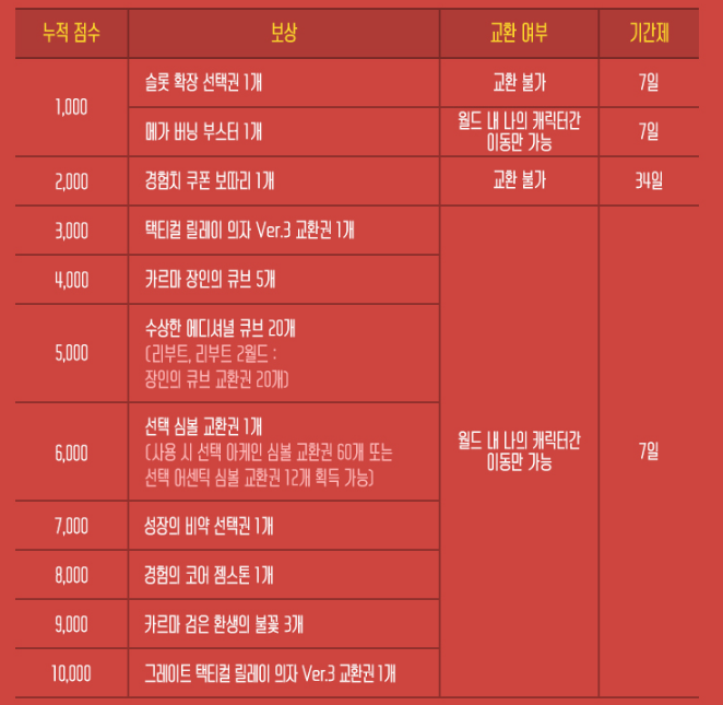 카르마 장인의 큐브 5개 / 수상한 에디셔널 큐브 20개 / 선택 심볼 교환권 / 성장 비약 선택권 /
