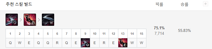 칼바람 사미라 스킬 마스터 순서는 Q > E > W 입니다.