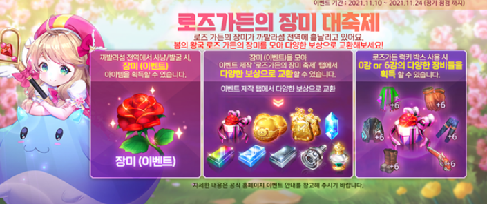 로즈가든의 장미를 모아 다양한 아이템 보상으로 제작하는 이벤트입니다.