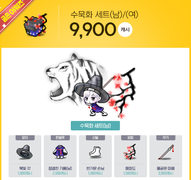 남 : 묵빛 갓 1000캐시 / 정결한 기품 2500캐시 / 반가운 손님 1000캐시 / 매화도 1500캐시 / 올곧은 마음 3900캐시