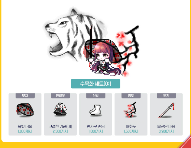 여 : 묵빛 너울 1000캐시 / 고결한 기품 2500캐시 / 반가운 손님 1000캐시 / 매화도 1500캐시 / 올곧은 마음 3900캐시