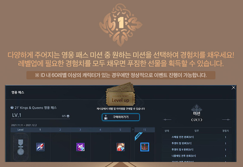 영웅 패스 미션 레벨업은 ID 내 60레벨 이상 캐릭터로 원할히 참여할 수 있습니다.
