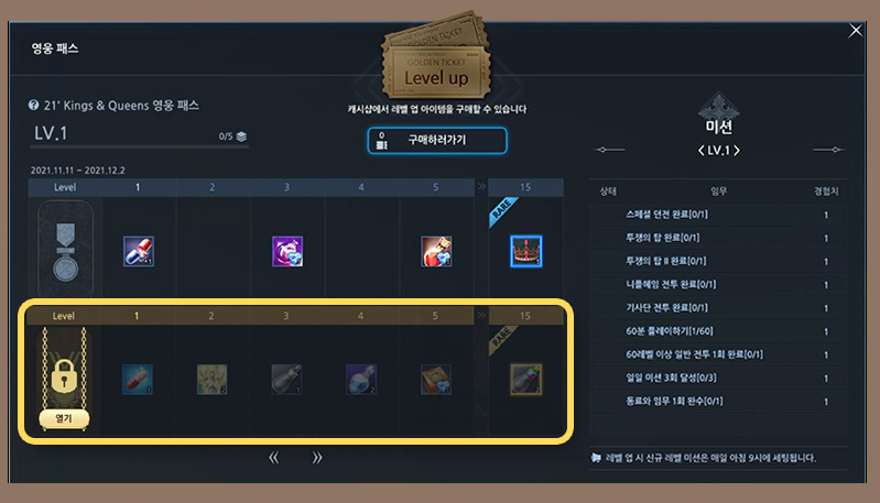 21' Kings & Queens 영웅 패스 레벨업 티켓 (60레벨 이상 권장) |