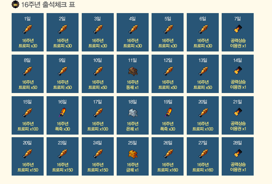 16주년 트로피, 공력상승이용권, 16주년 동궤, 16주년 폭죽, 16주년 은궤, 16주년 금궤