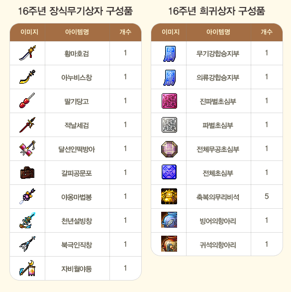 16주년 의류상자, 장식무기상자, 부활주문서(10회), 상급태화집혼석(30일), 개별무공초기부, 상급합성초기부,