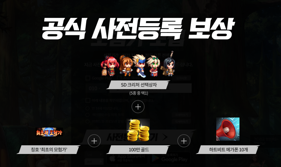 귀여운 SD크리처 선택 상자(5종 중 택1)와 칭호'최초의 모험가', 100만골드, 하트비트 메가폰10개를 사전등록 보상으로 받을 수 있습니다.