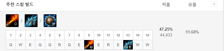 칼바람 럼블의 스킬 마스터 순서는 Q > E > W 입니다.