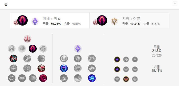 칼바람 럼블의 룬은 지배 + 마법을 선택합니다.