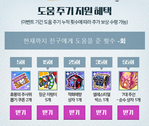 이벤트 기간 도움 주기 누적 횟수에 따라 아이템 보상을 받을 수 있습니다.