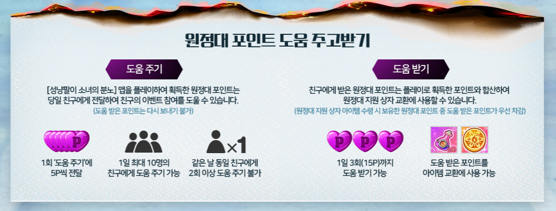 1일 최대 15P 원정대 포인트까지 친구로부터 원정대 포인트를 도움 받아 획득할 수 있습니다.