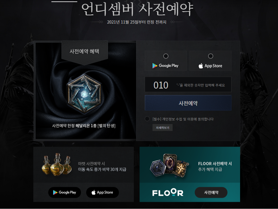 사전예약은 공식홈페이지, 마켓 사전등록, FLOOR 사전예약 3곳에서 진행하고 모든 보상을 받아야겠네요 ㅎㅎ