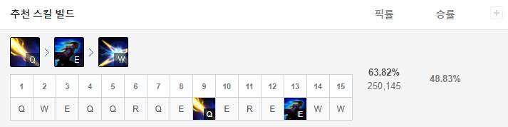 칼바람 루시안의 스킬 마스터 순서는 Q > E > W 입니다.