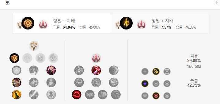 칼바람 루시안 룬은 정밀 + 지배를 선택합니다.