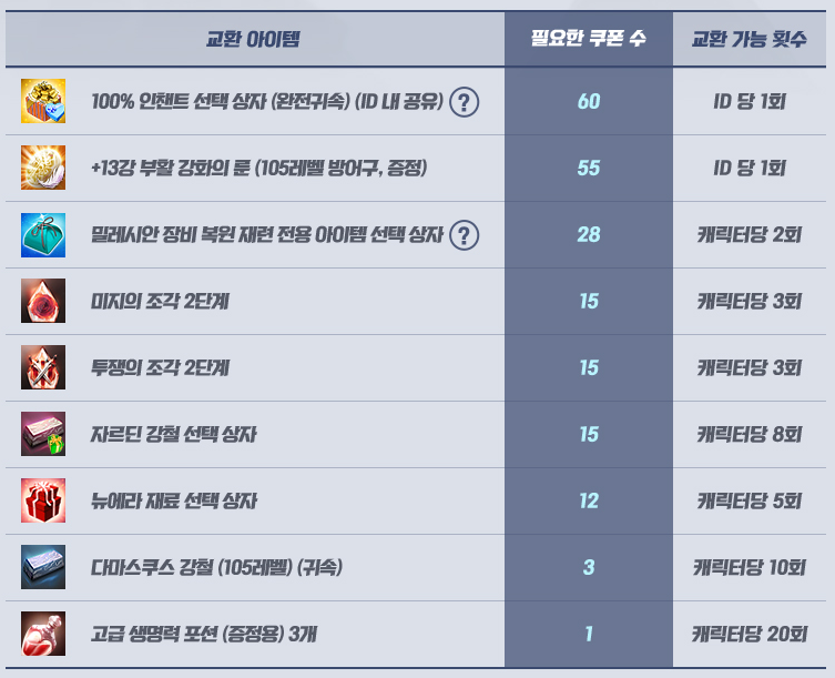 밀레시안 장비 복원 재련 전용 아이템 선택 상자 : 쿠폰28장, 캐릭터당 2회
