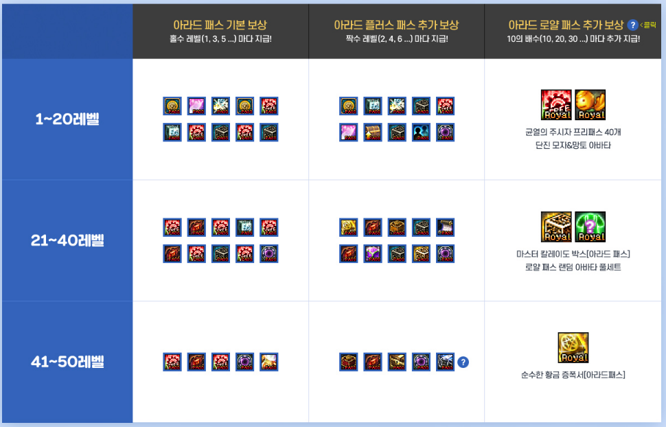 아라드 패스 기본 보상은 홀수 레벨 1, 3, 5 마다 지급됩니다.