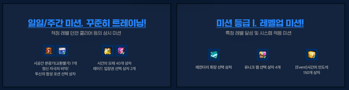 이벤트 기간동안 빠른 성장은 물론 레벨업 보상과 미션 보상으로 더욱 빠르고 알차게 캐릭터를 육성할 수 있는