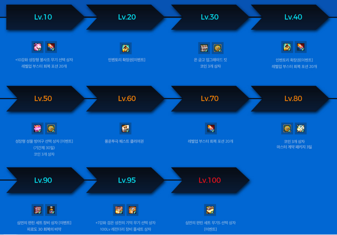| 40레벨 | 인벤토리 확장권[이벤트], 레벨업 부스터 회복 포션 20개 |